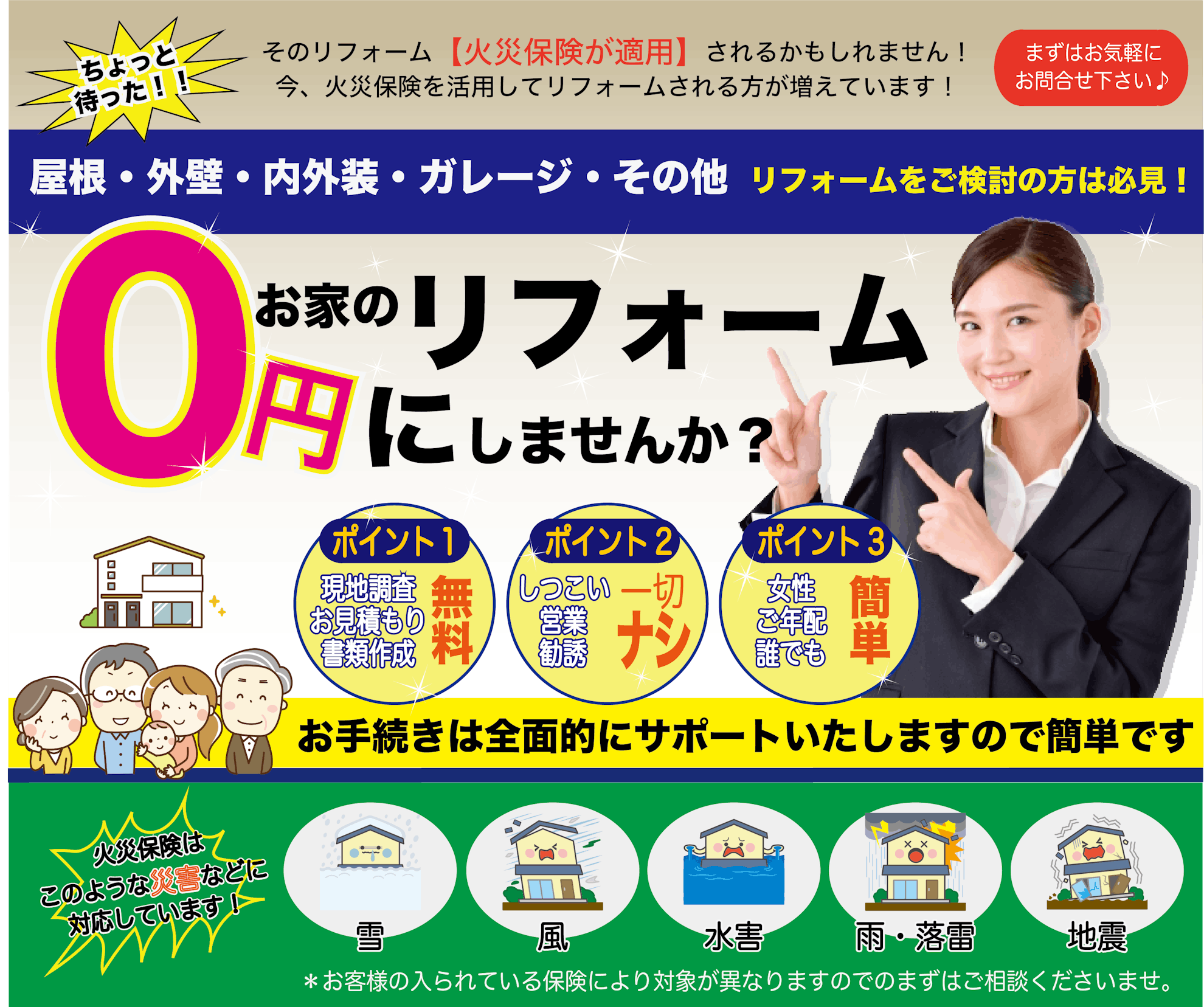 「予算的にリフォームが厳しい」というお客様も、保険が適用になり、0円でリフォームができた方も多数あり、お喜びの声をいただいております。